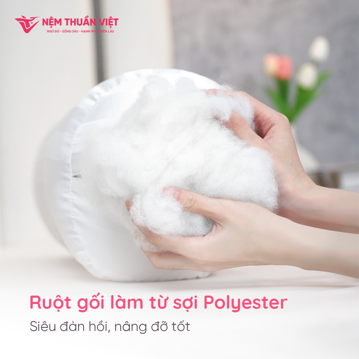 Ruột gối nằm Dreamy Thuần Việt được làm từ sợi bông gòn nhân tạo Polyester. Sợi bông có đặc tính siêu mỏng nhẹ và mềm mại, ít bị co và không gây xẹp lún. Áo gối được làm từ vải gấm xốp cao cấp với đặc tính thấm hút mồ hôi, thông thoáng và êm ái khi nằm.